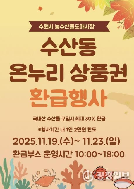 수원시 관계자는 “국내 수산물 소비를 활성화하고, 소비자가 저렴한 가격에 수산물을 구매할 수 있도록 온누리상품권 환급행사를 연다”며 “많은 분이 수원시농수산물도매시장을 찾아주시길 바란다”고 말했다.