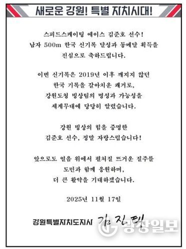 이에, 김진태 도지사는 “김준호 선수의 남자 500m 한국 신기록 달성과 동메달 획득을 진심으로 축하드린다”며, “이번 신기록은 강원도청 빙상팀의 명성과 가능성을 세계무대에 당당히 알렸다”고 말했다.