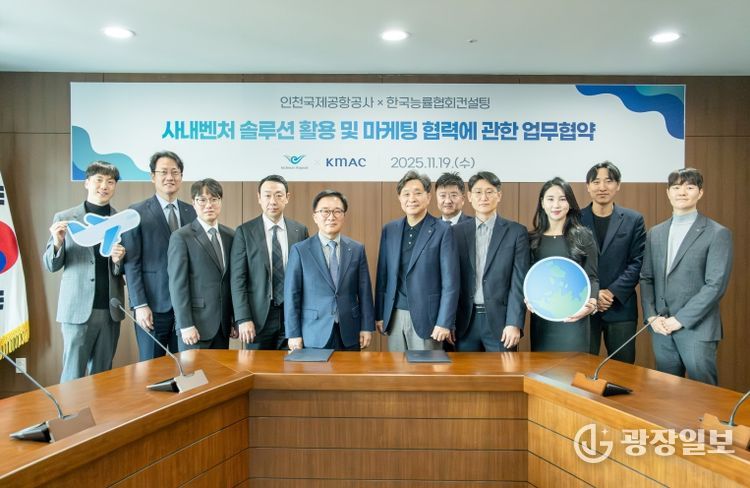 광장일보 주재영 기자 | 인천국제공항공사(사장 이학재)는 19일 오전 공항청사 회의실에서 한국능률협회컨설팅(KMAC)과 ‘인천공항 사내벤처 솔루션* 활용 및 마케팅 협력을 위한 업무협약(MOU)’을 체결했다고 밝혔다.