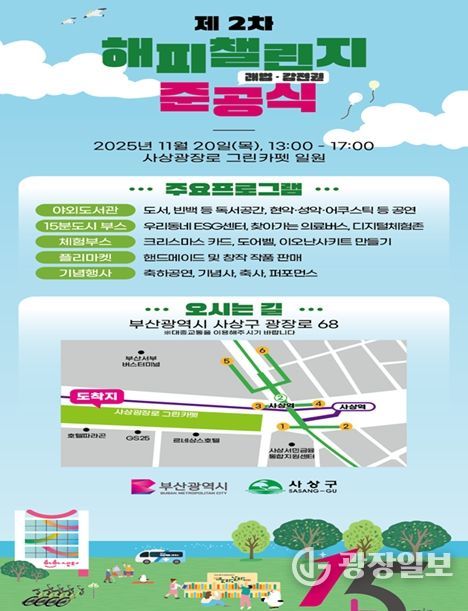 광장일보 주재영 기자 | 부산시는 오늘(20일) 오후 2시 30분, 새로 조성된 사상광장로 그린카펫에서 15분도시 '제2차 해피챌린지' 괘법·감전 생활권 준공식을 개최한다고 밝혔다.