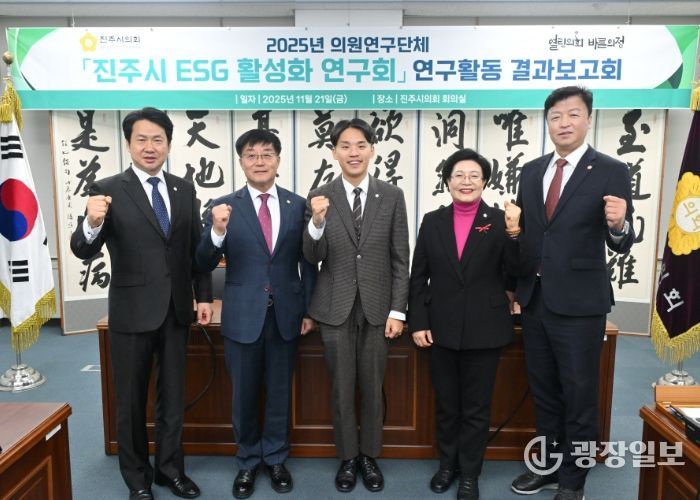 광장일보 주재영 기자 | 진주시의회 의원 연구단체 ‘진주시 ESG 활성화 연구회’는 21일 올해 연구활동을 마감하는 결과보고회를 열고, 연간 추진 성과와 향후 정책 제언을 공유했다고 밝혔다.