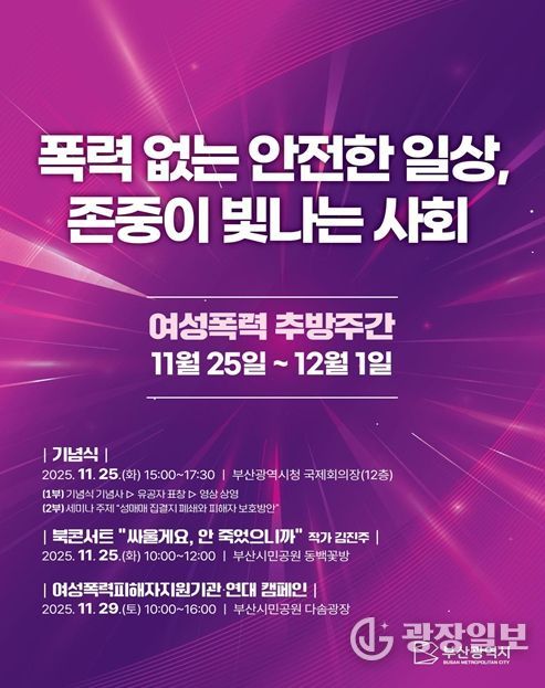 광장일보 주재영 기자 | 부산시는 내일(25일)부터 12월 1일까지 '2025 여성폭력 추방주간'을 운영한다고 밝혔다.
