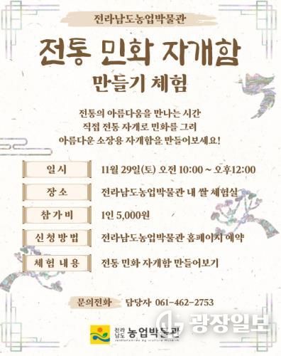 광장일보 주재영 기자 | 전라남도농업박물관이 점차 사라지는 전통문화의 의미를 되새기기 위해 오는 29일 오전 10시부터 2시간 동안 박물관 쌀 체험실에서 ‘전통 민화 자개함 만들기 체험’ 행사를 펼친다.