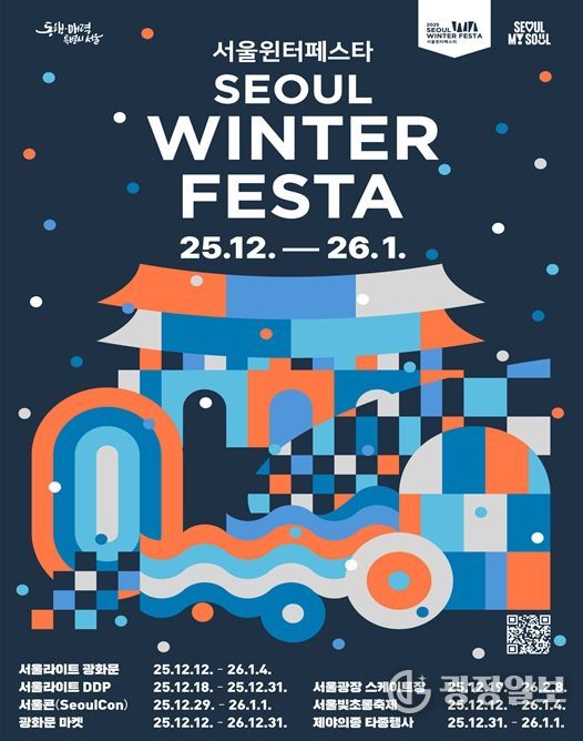 서울시는 12월 12일부터 2026년 1월 4일까지 24일간, 광화문광장~청계천~서울광장~DDP~보신각~우이천 6곳을 잇는 초대형 겨울축제 '2025 서울윈터페스타'를 개최한다고 밝혔다. 올해 행사는 궁중문화축전 및 전국무용제 등 대한민국 대표축제를 성공적으로 이끈 이재원 총감독이 지휘한다.