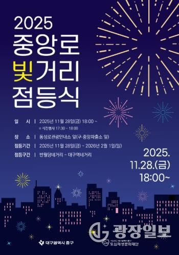 광장일보 주재영 기자 | 대구 중구는 오는 28일 오후 6시, 동성로관광안내소 앞에서 ‘2025 중앙로 빛거리 점등식’을 개최한다고 밝혔다.