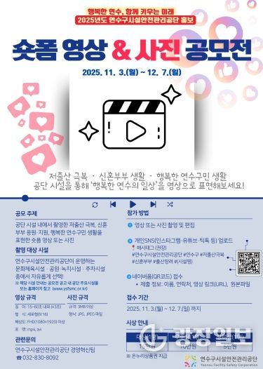 광장일보 주재영 기자 | 연수구시설안전관리공단(이사장 직무대행 장해윤)은 주민 참여를 확대하고 저출산 극복 메시지 확산을 강화하기 위해 추진 중이던 ‘숏폼 영상 공모전’을 ‘숏폼 영상&사진 공모전’으로 확대 변경해 오는 12월 7일까지 진행한다고 밝혔다.