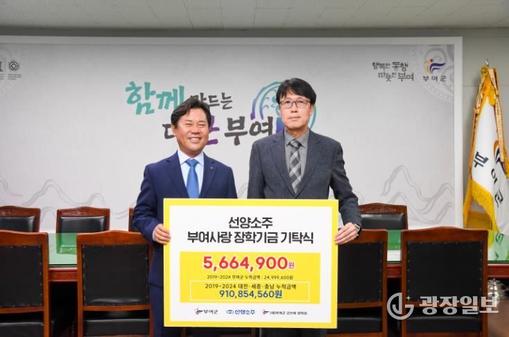 광장일보 주재영 기자 | ㈜선양소주는 지난 26일 부여군청을 방문하여 인재 육성을 위한 장학금 566여만 원을 (재)부여군굿뜨래장학회에 기탁했다.