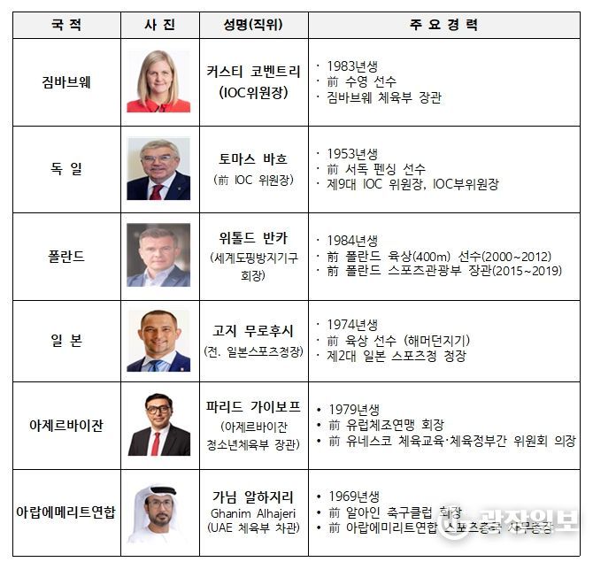 어제(2일)는 총회 개회식에 참석한 ▲커스티 코벤트리(Kirsty Leigh Coventry) 국제올림픽위원회(IOC) 위원장 ▲토마스 바흐(Thomas Bach) 전(前) 국제올림픽위원회(IOC) 위원장 ▲위톨드 반카(Witold Banka) 세계도핑방지기구 회장 ▲고지 무로후시(Koji Murofushi) 전(前) 일본 스포츠청장 등과 만남을 가졌다.