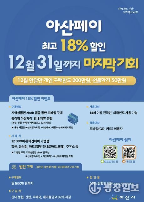 광장일보 주재영 기자 | 12월은 아산페이를 가장 똑똑하게 활용할 수 있는 ‘마지막 찬스’다. 아산시는 올해 12월은 아산페이 사용자에게 최대 18%의 직접 혜택은 물론, 연말정산 소득공제까지 동시에 받을 수 있는 기간이라며 시민들의 적극적인 이용을 당부했다.