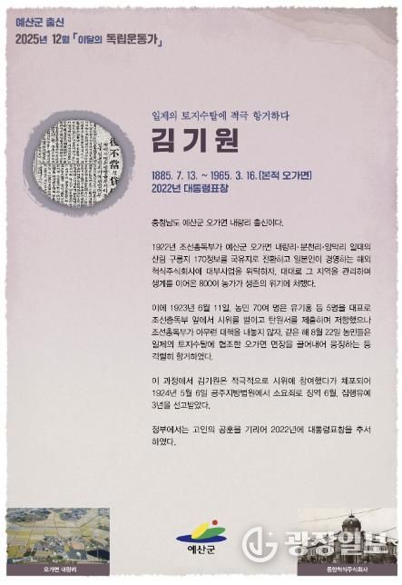 광장일보 주재영 기자 | 예산군은 오가면 내량리 출신 김기원 선생을 2025년 12월 ‘이달의 독립운동가’로 선정했다고 밝혔다.