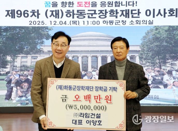 광장일보 주재영 기자 | (재)하동군장학재단 이양호 이사장이 지난 4일 열린 제96차 하동군장학재단 이사회에 앞서 지역 인재 육성을 위한 장학기금 500만 원을 출연하며, 22년째 후학 사랑을 실천하고 있다.