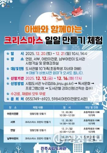 광장일보 주재영 기자 | 진주시립도서관은 ‘아빠와 함께하는 2025년 크리스마스 일일 만들기 체험’ 특강 참가자를 모집한다.