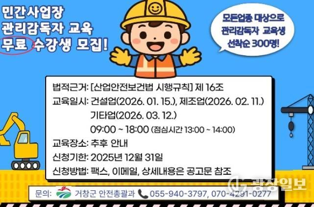 광장일보 주재영 기자 | 거창군은 이달 31일까지 민간사업장 관리감독자를 대상으로 한 안전보건교육 참여 신청을 접수하고 있다.