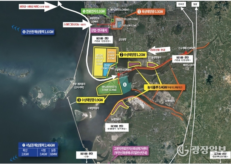 새만금에는 태양광 3GW, 해상풍력 4GW 등 총 7GW 규모의 재생에너지 발전단지가 조성 중이며, 2029년부터는 수상태양광 1.2GW를 RE100 기업에 공급할 계획이다. 또한 1.5GW 규모의 전력 공급 능력과 광역 전력망 연계 여건을 갖춰 AI 데이터센터 등 대규모 전력 수요 기업 유치에 강점을 지닌다.