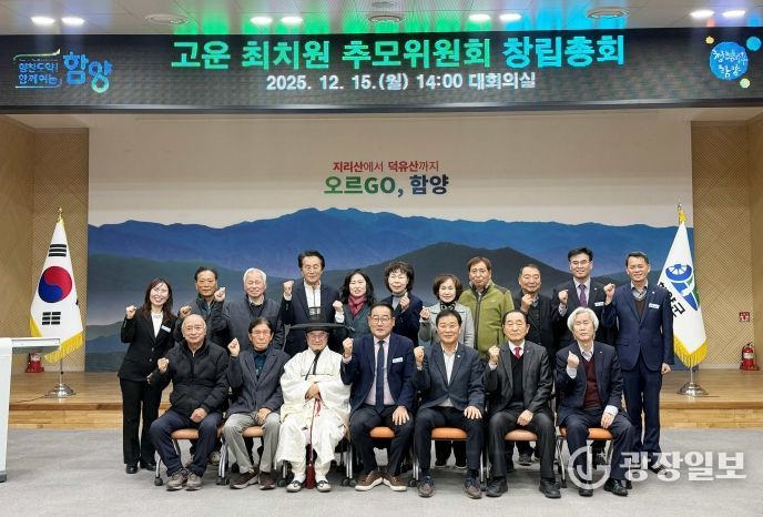 광장일보 주재영 기자 | 함양군은 12월 15일 군청 대회의실에서 ‘고운 최치원 추모위원회 창립총회’를 개최하고, 우리나라 최초의 인공 숲인 상림을 조성한 고운 최치원 선생의 정신을 오늘의 시대정신으로 되살리기 위한 민관 협력의 새로운 출발을 공식화했다고 밝혔다.