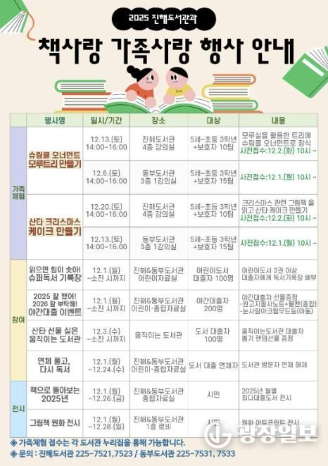 광장일보 주재영 기자 | 창원특례시 진해도서관과는 연말을 맞아 가족과 함께 즐길 수 있는 따뜻하고 풍성한 ‘2025 책사랑 가족사랑 행사’를 진해도서관 및 동부도서관에서 12월 한 달간 운영한다.