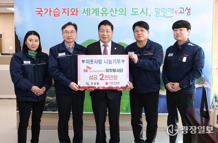광장일보 주재영 기자 | 고성군은 sk오션플랜트 띠앗봉사단이 12월 17일 고성군을 방문해 관내 저소득층 지원을 위한 이웃돕기 성금 2,000만 원을 기탁했다고 밝혔다.