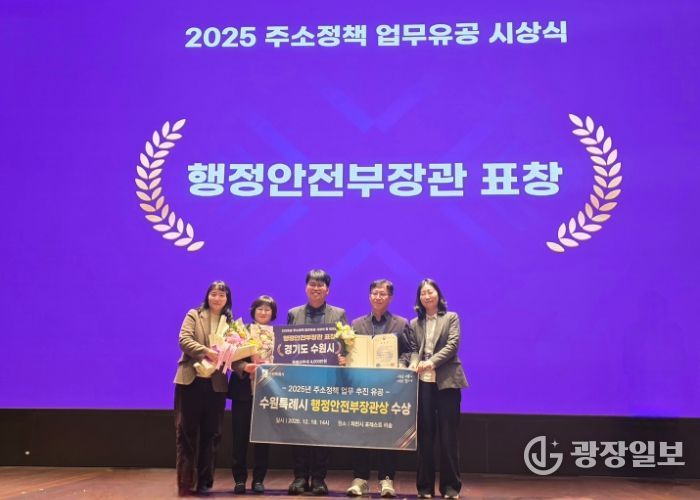 광장일보 나학천 기자 | 수원특례시가 행정안전부 주관 ‘2025 주소정책 워크숍’에서 ‘2025 주소정책 업무 분야 우수기관’으로 선정돼 행정안전부 장관 표창을 받았다. 특별교부세 4000만 원도 확보했다.