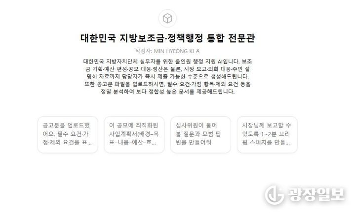 영예의 대상은 조양동주민센터 민형기 행정팀장이 차지했다. 민 팀장은 ‘대한민국 지방보조금 정책 행정 통합 전문관’ 작품을 통해 복잡한 지방보조금 업무를 AI로 통합 관리·효율화하는 모델을 제시해 심사위원들의 높은 평가를 받았다. 대상 수상자에게는 시장 표창과 함께 50만 원의 상금이 수여된다.