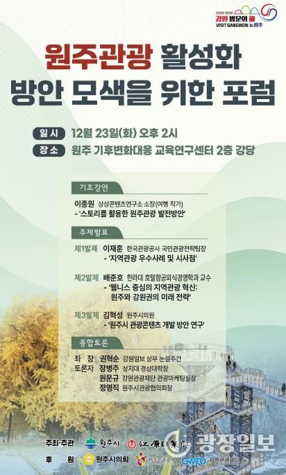 광장일보 이현나 기자 | 원주시는 오는 23일 오후 2시, 기후변화대응교육연구센터 2층 대강당에서 ‘원주관광 활성화 방안 모색을 위한 포럼’을 개최한다.