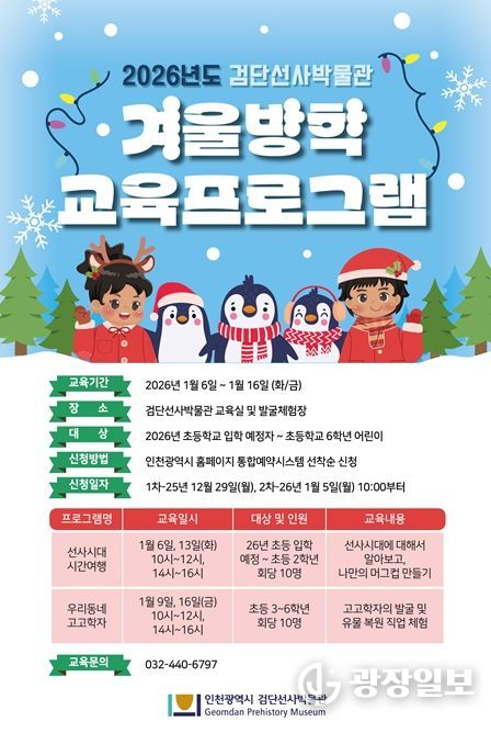 광장일보 주재영 기자 | 인천광역시 검단선사박물관은 2026년 1월 6일부터 16일까지, 겨울방학 교육 '선사시대 시간여행'과 '우리동네 고고학자'를 진행한다고 밝혔다.