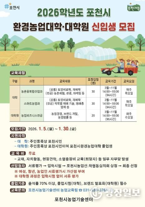 광장일보 이현나 기자 | 포천시는 2026년 1월 5일부터 30일까지 ‘2026학년도 포천시 환경농업대학 및 대학원’ 신입생을 모집한다.