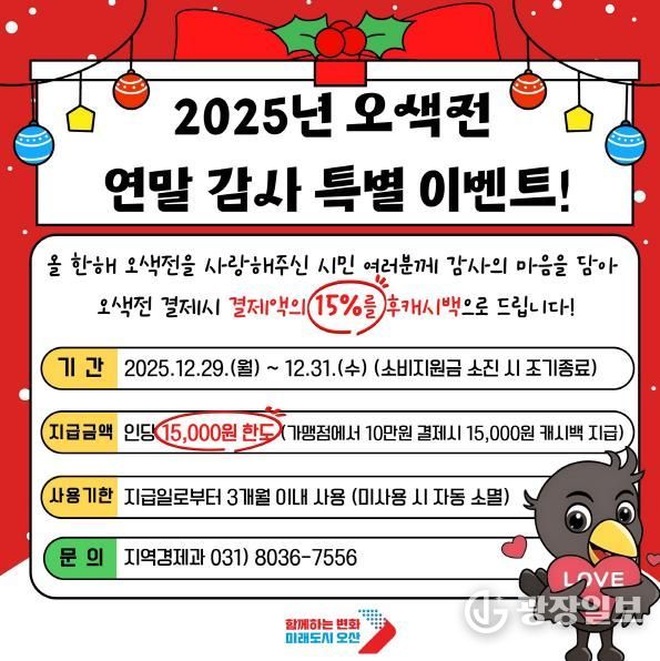광장일보 나병석 기자 | 오산시는 한 해 동안 지역화폐를 이용해 준 시민들에게 감사의 뜻을 전하고, 연말 소비 활성화를 도모하기 위해 ‘2025년 오색전 연말 감사 특별 이벤트’를 추진한다.