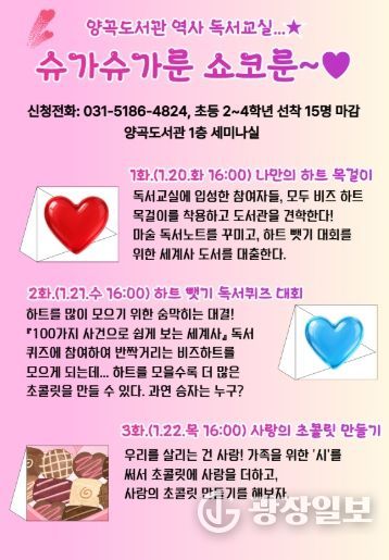 광장일보 이현나 기자 | 김포시는 2026년 1월 20일 오후 4시부터 6시까지 1층 세미나실에서 초등학교 2~4학년을 대상으로 한 역사 독서교실 '슈가슈가룬 쇼코룬'을 운영한다.