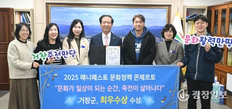 광장일보 주재영 기자 | 거창군은 강원특별자치도 원주시 상지대학교에서 개최한 ‘2025 전국 기초단체장 매니페스토 문화정책 콘체르토(Concerto)’ 대회에서 문화기반 도시활력분야 ‘최우수상’을 수상했다고 26일 밝혔다.