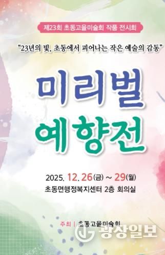광장일보 주재영 기자 | 밀양시 초동고을미술회는 26일부터 29일까지 초동면 행정복지센터 2층 회의실에서 제23회 ‘미리벌 예향(藝鄕)전’을 개최한다.