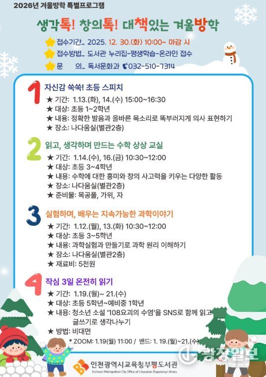 광장일보 주재영 기자 | 인천광역시교육청부평도서관은 겨울방학을 맞아 1월 한달간 새 학년을 준비하는 초등학생과 중학생을 대상으로 겨울방학 특별프로그램을 운영한다.