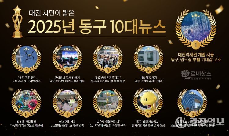 광장일보 이현나 기자 | 대전 동구는 주민들이 직접 참여하고 동구GPT 분석을 통해 선정한 ‘2025년 동구 10대 뉴스’ 투표 결과, ‘대전역세권 개발 시동’이 압도적인 1위를 차지했다고 29일 밝혔다.