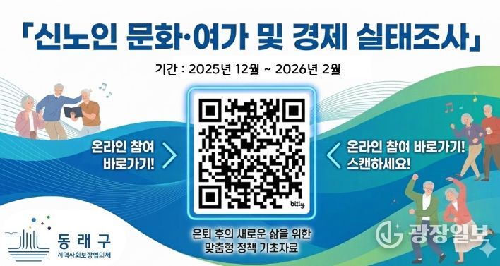 광장일보 주재영 기자 | 부산 동래구는 지역사회보장협의체(위원장 조정래) ‘신노인분과’가 급속한 고령화와 사회 구조 변화 속에서 새롭게 등장한 ‘신노인’ 세대의 삶과 욕구를 체계적으로 파악하기 위해 '신노인 문화·여가 및 경제 실태조사'를 12월부터 2026년 2월까지 약 3개월간 실시한다고 밝혔다.