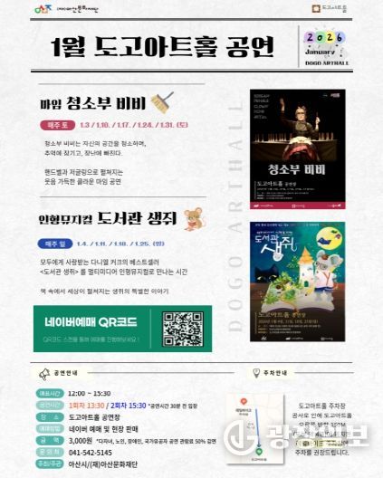 광장일보 주재영 기자 | 아산문화재단(대표이사 유성녀)이 운영하는 도고아트홀이 2026년 1월, 주말 상시 공연과 전시를 통해 새해 시민들의 문화 일상화를 이어간다. 이번 프로그램은 가족 단위 관람객과 어린이를 중심으로 공연과 전시를 함께 즐길 수 있도록 구성돼 있어, 새해 첫 달부터 풍성한 문화 향유 기회를 제공한다.