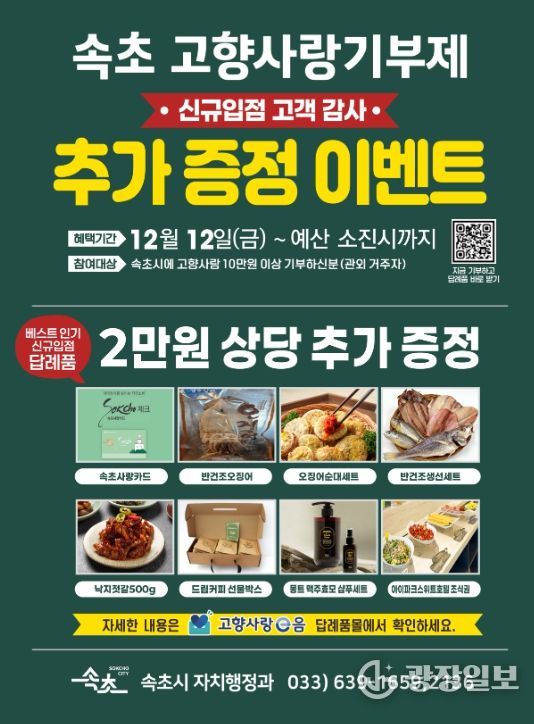 이벤트에는 12월에 새롭게 추가된 신규 답례품과 그간 많은 인기를 받아 온 오징어순대, 반건조 생선·오징어, 젓갈류, 속초사랑상품권이 포함돼 기부자 만족도를 높이는 동시에 신규 품목의 인지도 확산과 지역경제 활력 제고에도 도움이 될 것으로 기대된다.