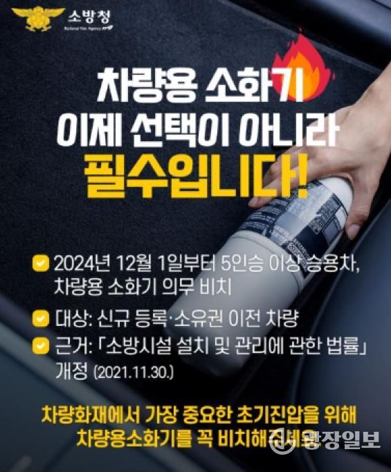 광장일보 주재영 기자 | 서산소방서는 차량 화재 발생 시 인명과 재산 피해를 최소화하기 위해 차량용 소화기 비치 의무에 대한 홍보를 강화하고 있다고 밝혔다.