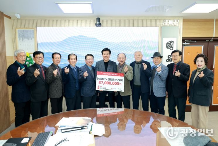 광장일보 주재영 기자 | (사)대한노인회금산군지회(지회장 양희성)는 지난 30일 금산관내 인구증가 지원사업에 소중히 쓰이길 바란다며 성금 87,000,000원을 기탁했다.