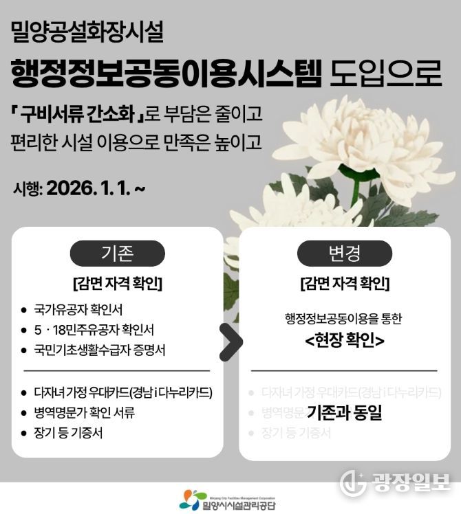 광장일보 주재영 기자 | 밀양시시설관리공단은 밀양공설화장시설을 이용하는 유가족의 편의를 높이기 위해 구비서류를 간소화하는 ‘행정정보 공동이용 시스템’을 오는 1월 1일부터 시행한다.