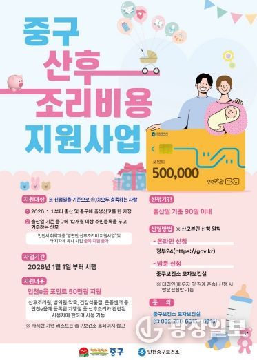 광장일보 주재영 기자 | 인천시 중구는 출산 가정의 경제적 부담을 덜어주기 위해 새해인 오는 2026년 1월 1일부터 ‘중구 산후조리비 지원 사업’을 본격적으로 시작한다고 밝혔다.