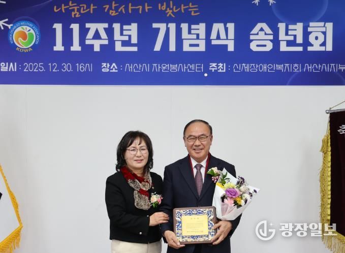 광장일보 주재영 기자 | 서산시의회 조동식 의장이 지난 30일 서산시자원봉사센터에서 열린 (사)충남신체장애인복지회 서산시지부 창립 제11주년 기념식 및 송년회에서 (사)한국신체장애인 충남복지회 서산시지부(지부장 최선아)로부터 감사패를 받았다.