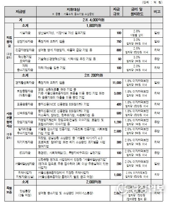 자금 유형별로는 ▴중소기업육성기금 재원으로 융자해 주는 ‘직접 융자금(고정금리)’ 1,800억 원 ▴시중은행 재원으로 자금을 융자, 대출금리 이자 일부를 서울시가 보전하는 ‘시중은행 협력자금(변동금리, 이자차액보전)’ 2조 200억 원 ▴마이너스통장 방식의 ‘안심통장(특별보증)’ 2,000억 원을 각각 공급한다.