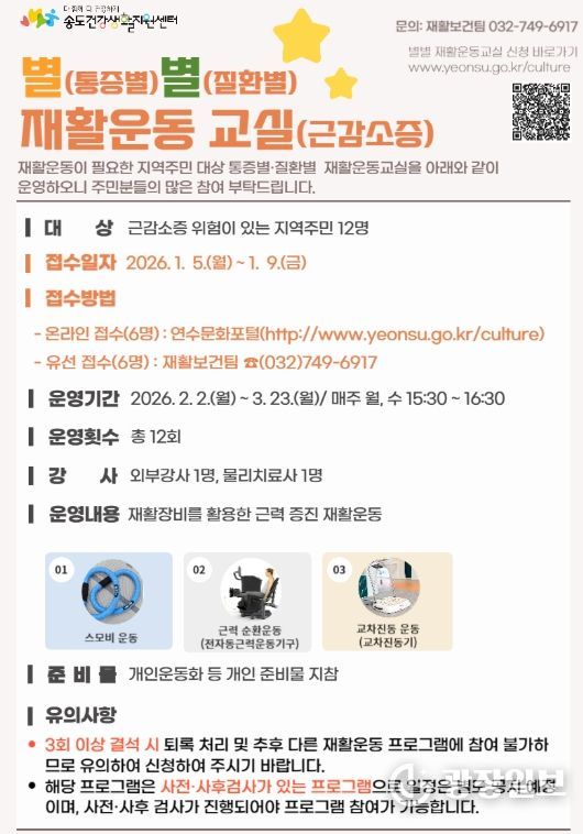 연수구 관계자는 “재활운동교실은 주민의 신체 회복을 돕고 일상에서 올바른 신체활동을 실천할 수 있도록 지원할 예정”이라며 “특히 질환별·통증별 세분화한 프로그램을 통해 운동에 대한 이해를 높이고, 지역사회 중심의 재활서비스를 지속적으로 강화해 나갈 계획”이라고 말했다.
