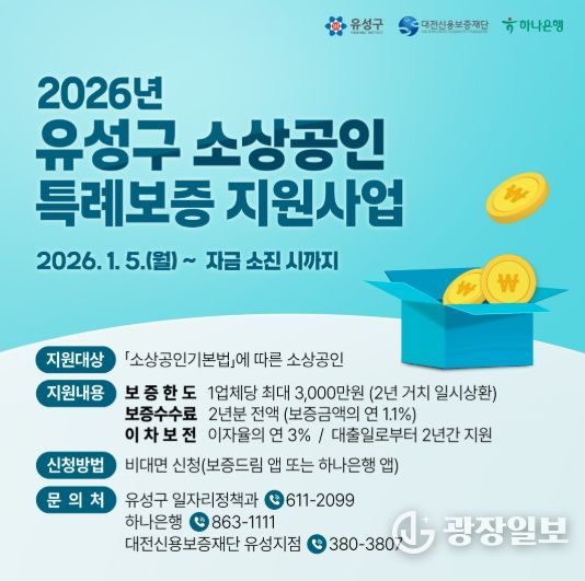 광장일보 이현나 기자 | 대전 유성구는 소상공인과 창업 기업의 금융 부담 완화를 위해 ‘2026년도 소상공인·창업 특례 보증 지원 사업’을 운영한다.