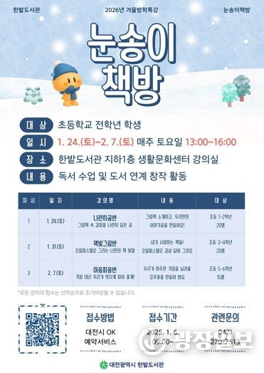 광장일보 이현나 기자 | 대전 한밭도서관은 겨울방학을 맞아 어린이들의 독서 흥미 고취를 위해 겨울방학특강‘눈송이 책방’을 운영한다.