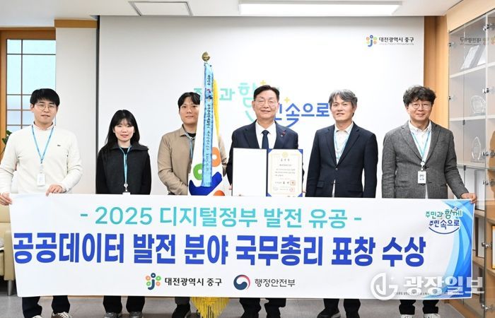 광장일보 이현나 기자 | 대전 중구는‘2025 디지털정부 발전 유공 정부포상’공공데이터 발전 부문에서 전국 기초자치단체 중 유일하게 국무총리 기관 표창을 수상했다고 4일 밝혔다.