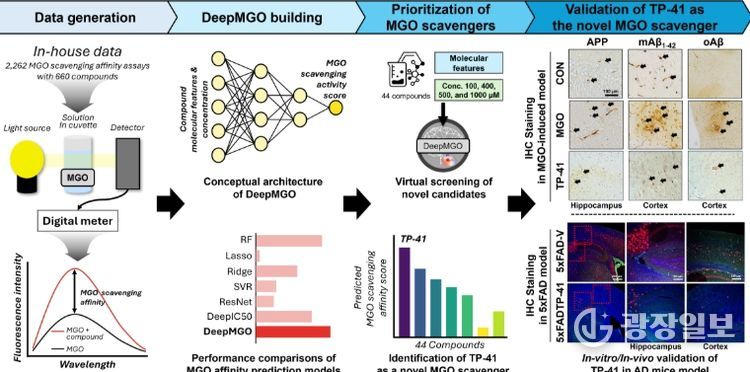 해당 모델을 활용한 AI 스크리닝으로 연구팀은 기존 트립토판 계열 물질보다 혈뇌장벽(BBB) 투과율이 우수한 신규 유도체 ‘TP-41’을 발굴하는 데 성공했다. TP-41은 MGO를 직접 소거하는 기전을 통해 독성을 낮추고, 뇌로의 전달 효율을 높인 것이 특징이다.
