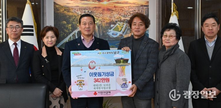 광장일보 주재영 기자 | 대구 남구는 대명3동 뉴타운 재개발사업 조합의 조합장(이대룡)을 비롯한 임원, 대의원 및 직원이 지난 2025년 12월 30일 연말을 맞아 어려운 이웃을 위해 써달라며 정성껏 모은 성금 342만원을 기탁했다고 밝혔다.