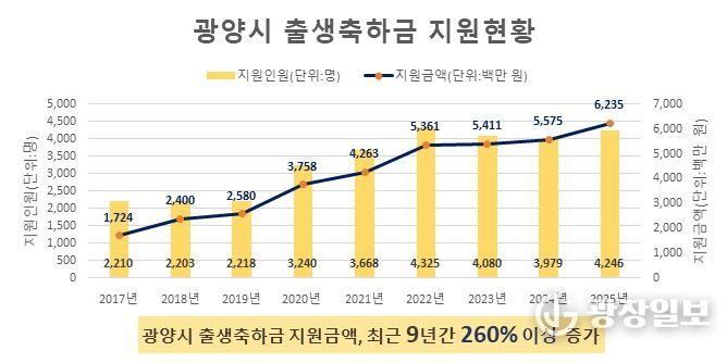 광양시의 출생축하금 지원 예산은 최근 9년 사이 크게 늘었다. 시에 따르면 2017년에는 17억 2,400만 원을 편성해 2,210명에게 지원했으며, 2025년에는 62억 3,500만 원을 투입해 4,246명에게 지원했다. 예산 기준으로 약 260% 이상 증가한 규모다.