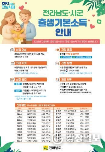 광장일보 주재영 기자 | 전라남도는 2024년생에 이어 전남에서 태어난 2025년생 출생아에게 전라남도–시군 출생기본소득을 지급한다.