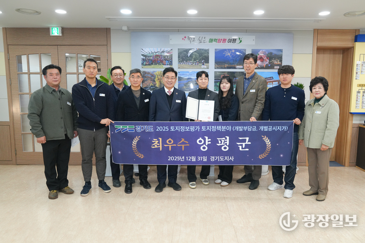 양평군= 주재영 기자 | 양평군(군수 전진선)은 경기도 가 주관한 ‘2025년 토지정보 종합평가’에서 토지정책 분야(개발부담금·개별공시지가) 최우수 기관으로 선정됐다고 밝혔다.
